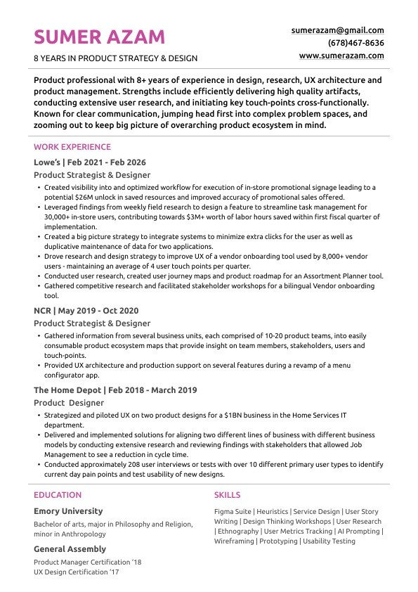 My academic background is a Bachelors Degree in Philosophy, Religion and Anthropology from Emory University. The primary transferable piece of my education is ethnographic research. This made for an easy transition into the UX industry after a 3-month long immersive program at General Assembly.